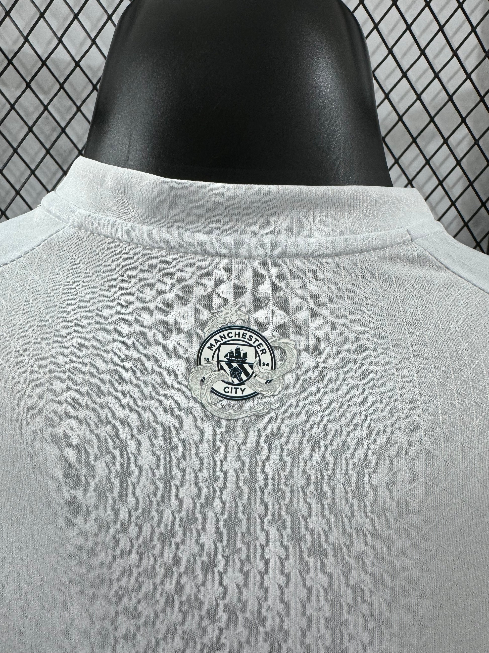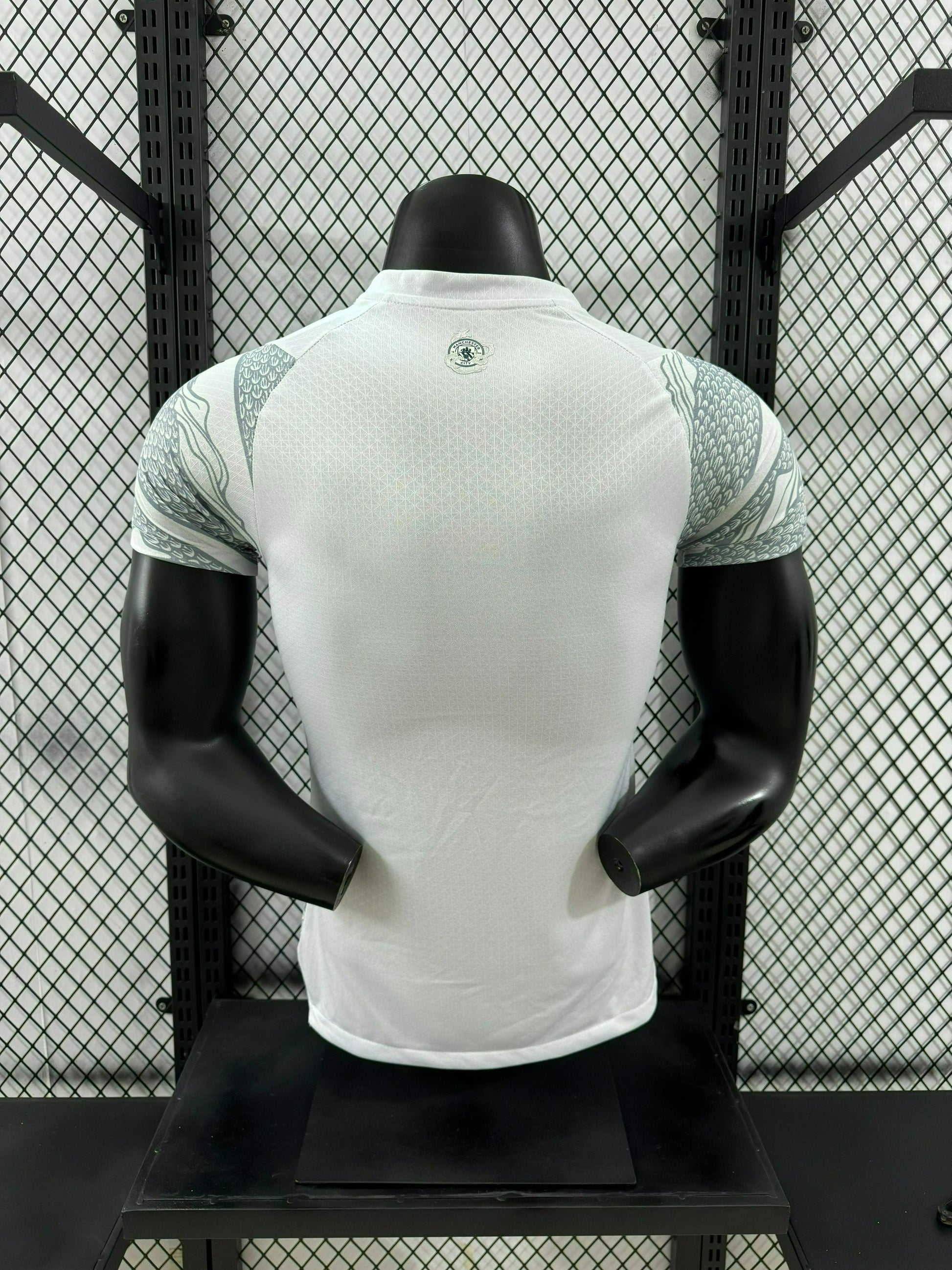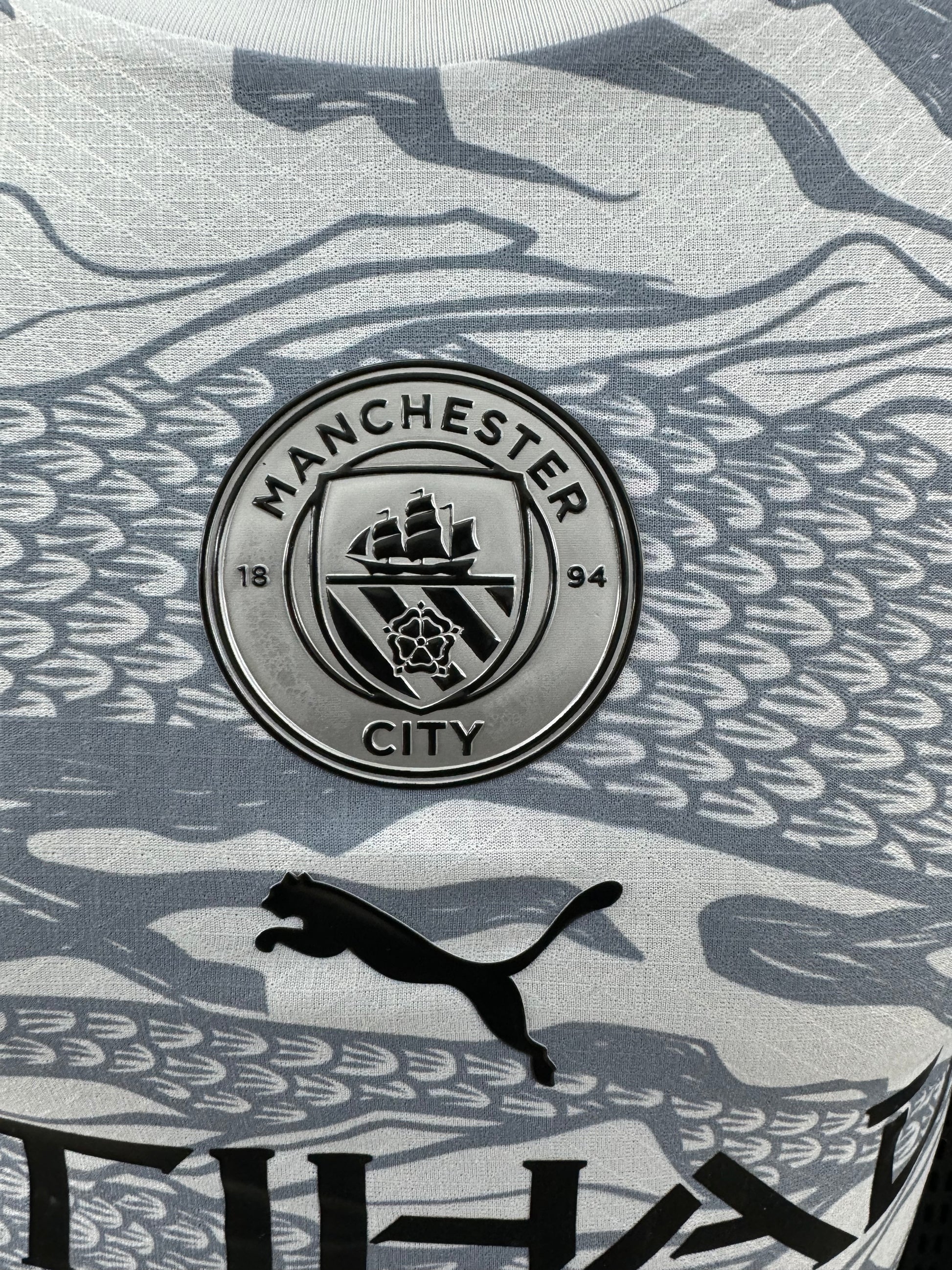 מהדורה מיוחדת של מנצ'סטר סיטי בהשראת הדרקון, עם דוגמה ייחודית בגווני לבן ואפור שמעניקה לחולצה מראה יוקרתי ודומיננטי.