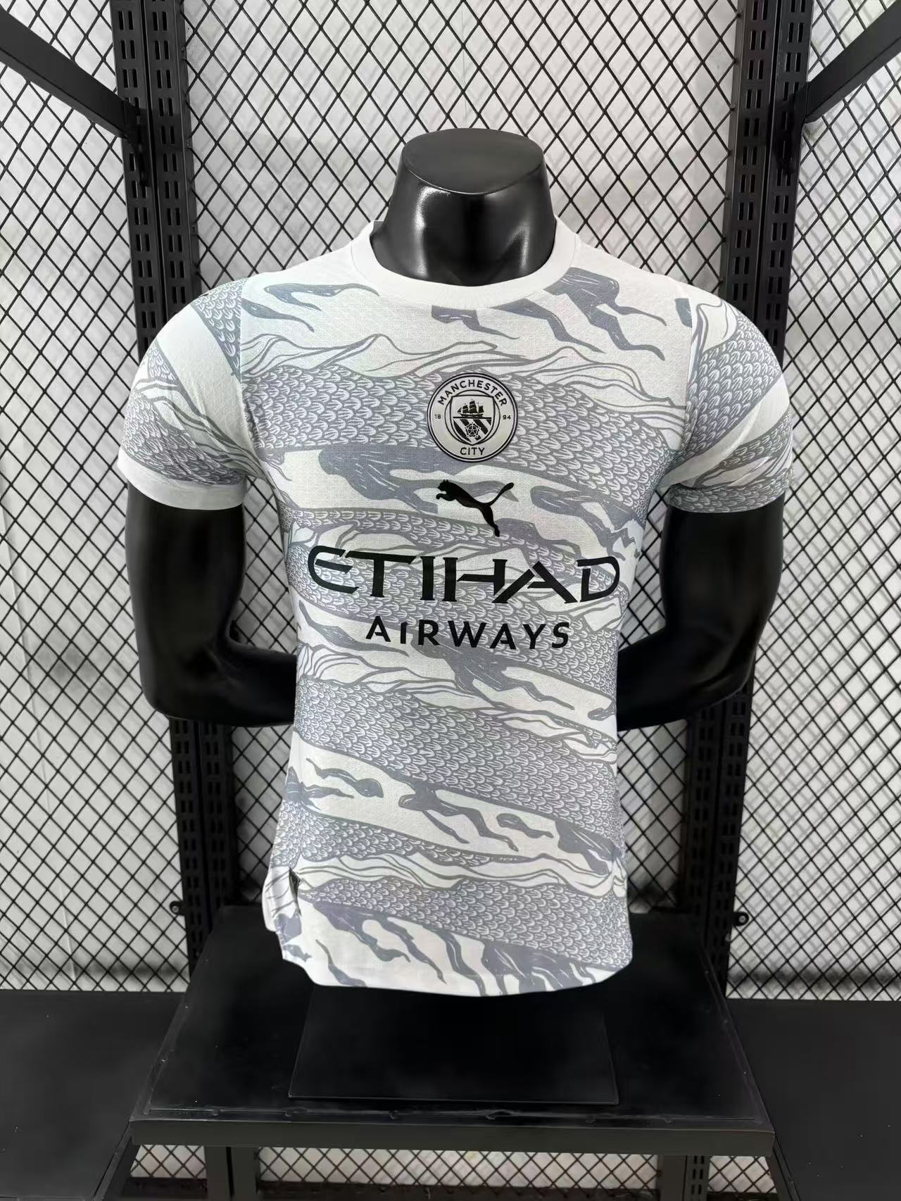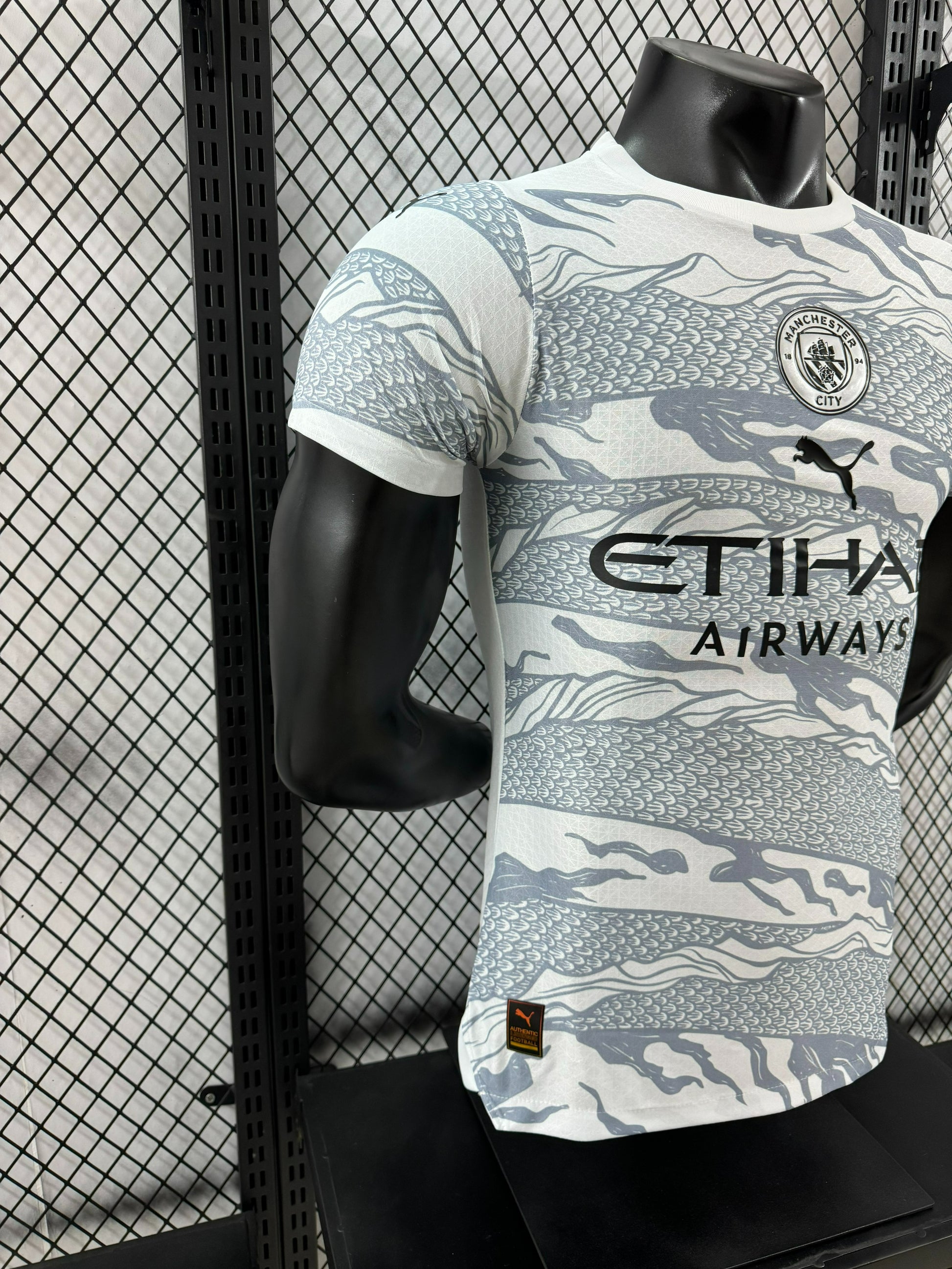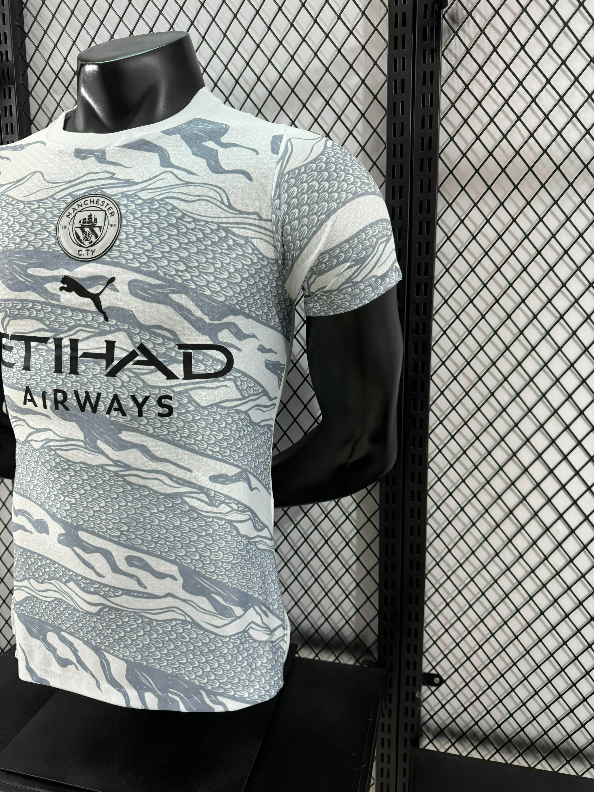 מהדורה מיוחדת של מנצ'סטר סיטי בהשראת הדרקון, עם דוגמה ייחודית בגווני לבן ואפור שמעניקה לחולצה מראה יוקרתי ודומיננטי.