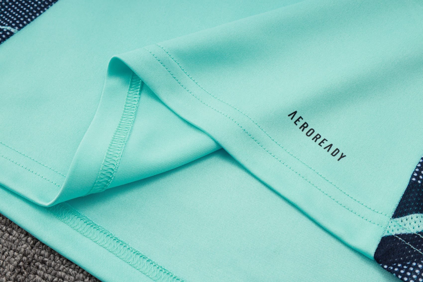 סט אימון איכותי של ריאל מדריד בצבע ירוק-טורקיז ייחודי, עם מכנסי נייבי מעוצבים.