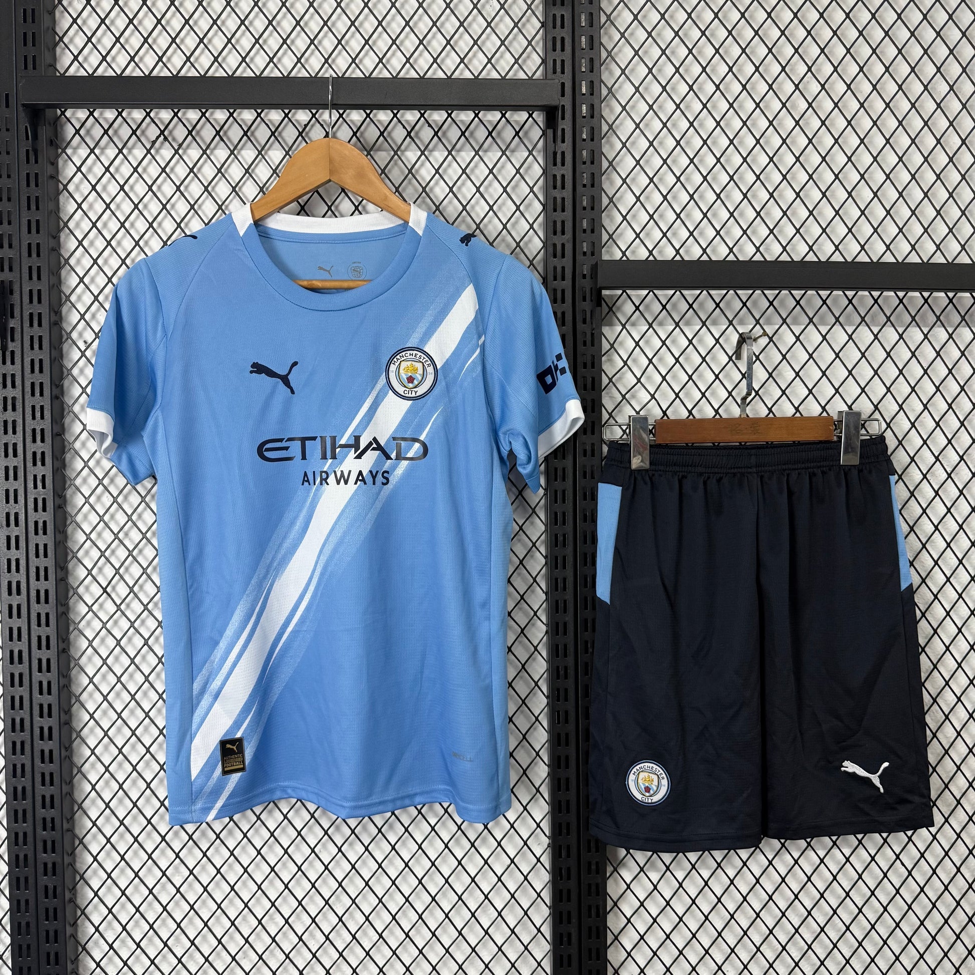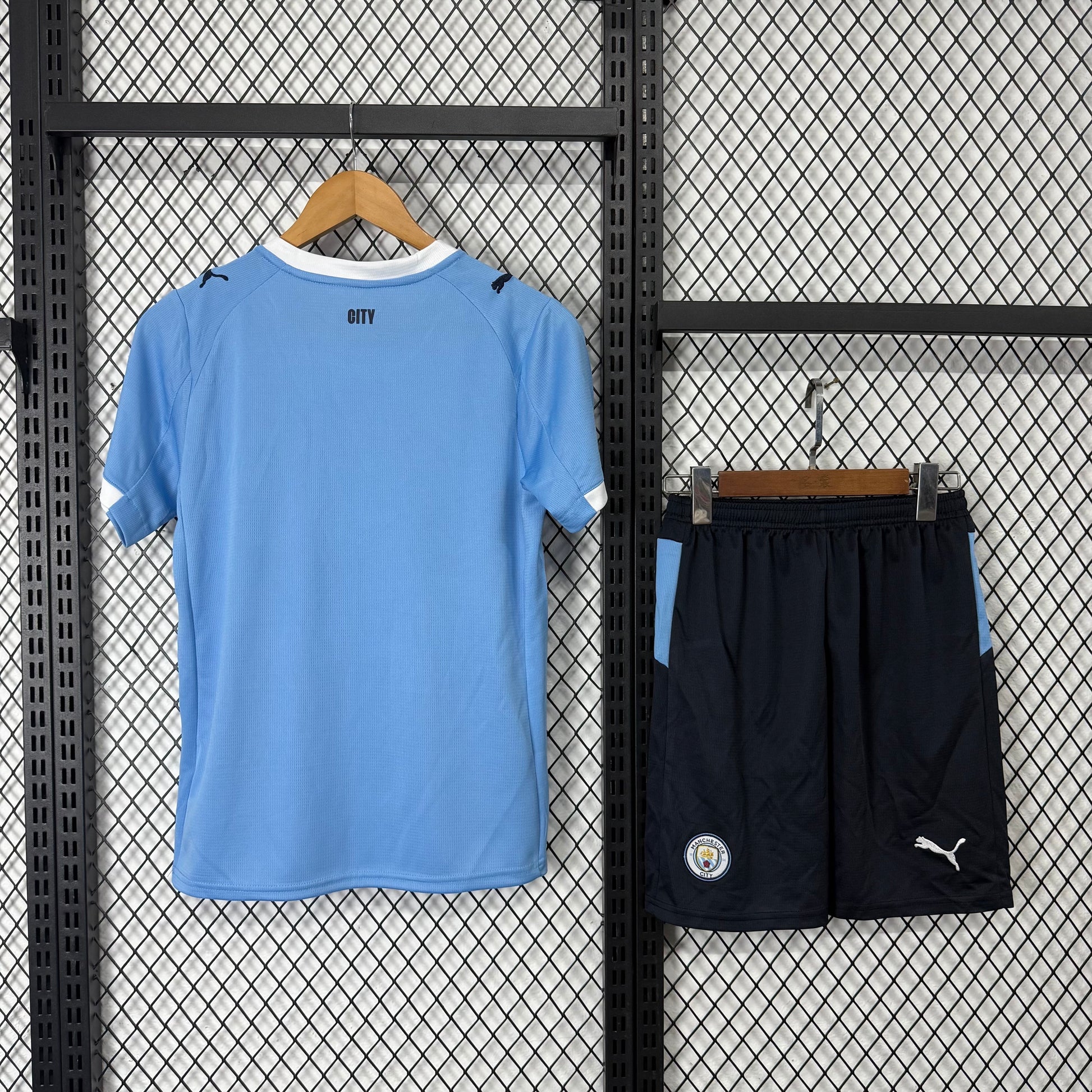 חליפת ילדים מנצ'סטר סיטי בית 25/26 – חולצה ומכנס בתכלת האלגנטי של אלופת אנגליה 💙⚽👑